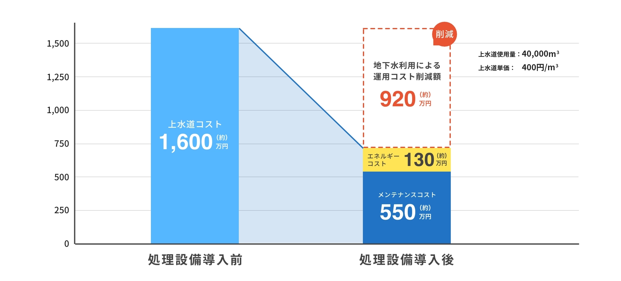 地下水は、膜ろ過システムや井水処理設備を導入することで、専用水道や雑用水として利用することができ、現状の水道料金と比較してコスト 削減することが可能です。